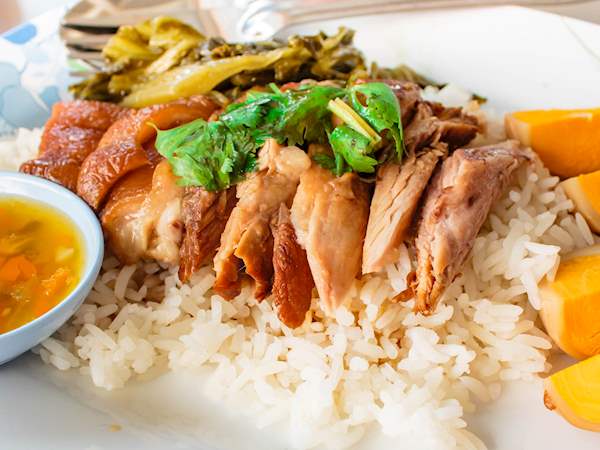 Là một món ăn cổ điển của Thái Lan, có nguồn gốc từ người Hoa. Món ăn này được du nhập vào Thái Lan từ thế kỷ 19, và đã được người Thái biến tấu để phù hợp với khẩu vị của họ. Trong tiếng Thái, “Khao Kha Moo” có nghĩa là “cơm và thịt lợn”. Món ăn này được làm từ thịt lợn ba chỉ, cơm, và các loại gia vị như nước mắm, đường, sả, và gừng. Thịt lợn ba chỉ được hầm nhừ trong nước dùng đậm đà, sau đó được xào với cơm và các loại gia vị.